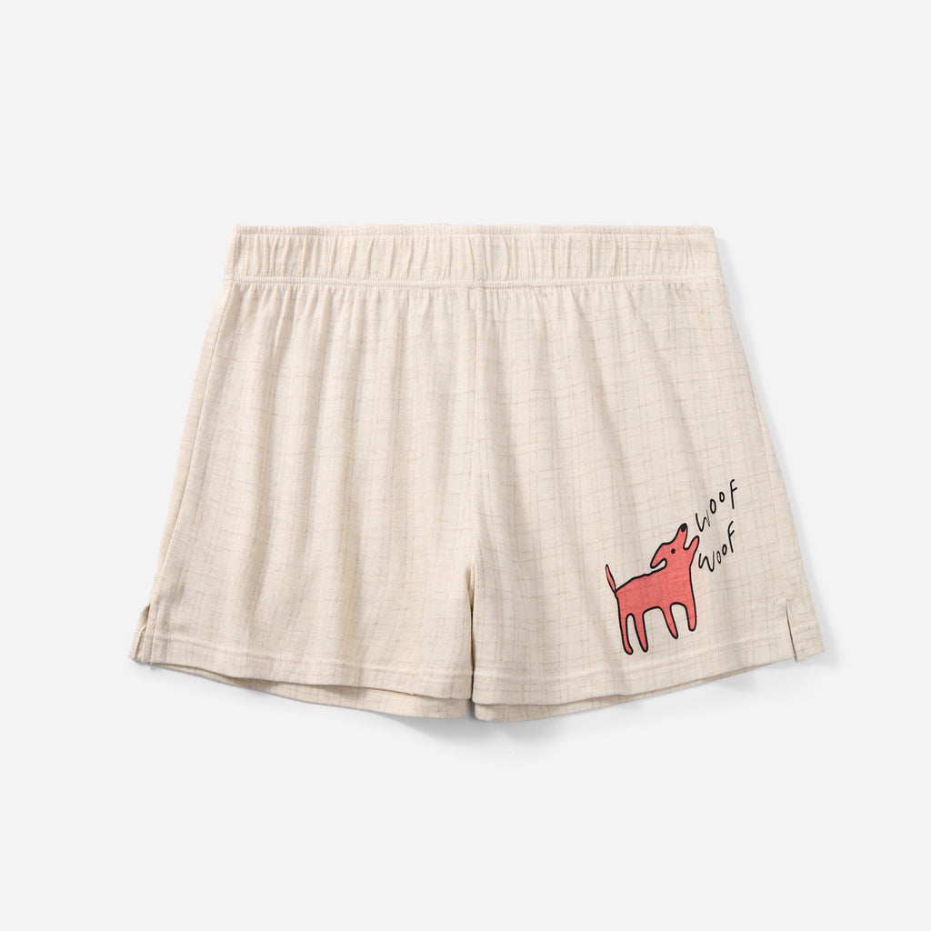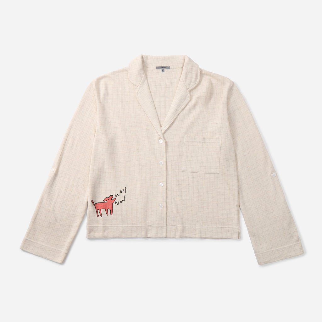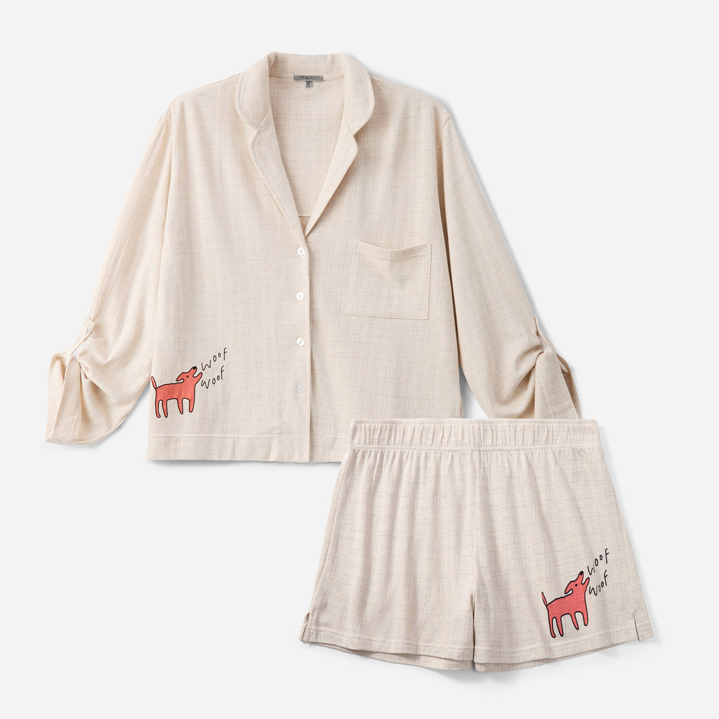 犬のプリント(シャツの右下とパンツの左下)