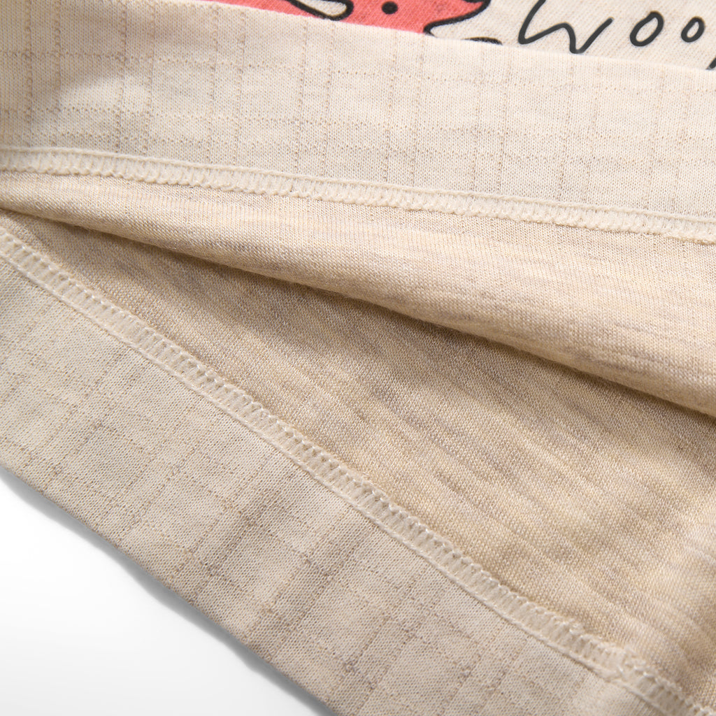彼女のアートのポップで陽気な雰囲気に感銘を受け、私たちはカセレスに「Everyone loves an Underdog」コレクション用のアートワーク作成を依頼しました。その結果、愛らしく「ワンワン」と吠える犬のモチーフが新たに作成された生地に登場しました。