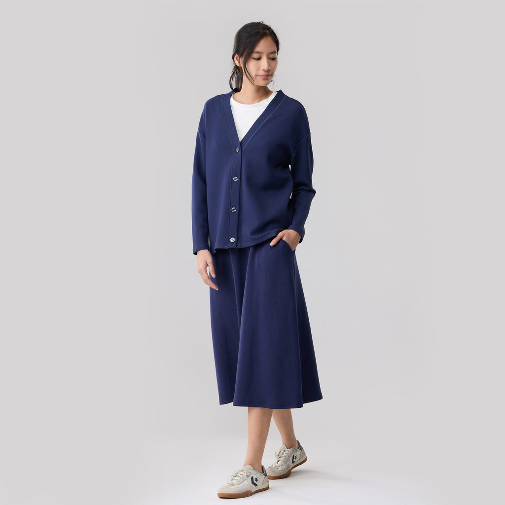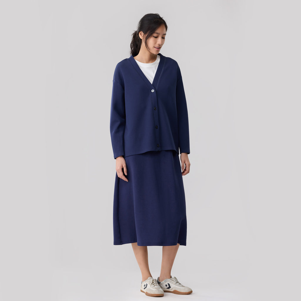 新素材のダブルニットは、きめ細かく編み立てられたニット地を二層に仕立てることで高い保湿性を確保。突然の冷え込み時の羽織にピッタリ。軽量で嵩張らず、携帯するにも便利。シワになりにくいので、普段使いにも旅行にも最適です。カーディガン、パンツ、ジッパージャケット、プルオーバーは、すべてユニセックスデザインです。