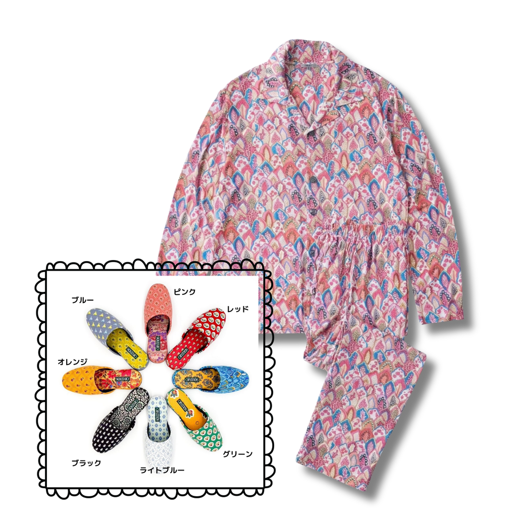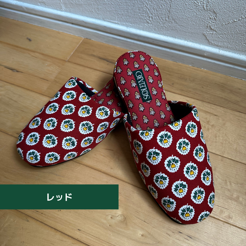 世界各国の歴史と文化を象徴する様々な伝統柄テキスタイルを、甲の部分、底の部分、ハカマの部分に色柄をミックスして作りました。左右や部位の色柄をあえて切り替えたデザインにすることで、「自分だけの組み合わせ」を楽しんでいただけるスリッパです。足元をカラフル&楽しい雰囲気に変えて、おうち時間を楽しんでみませんか?